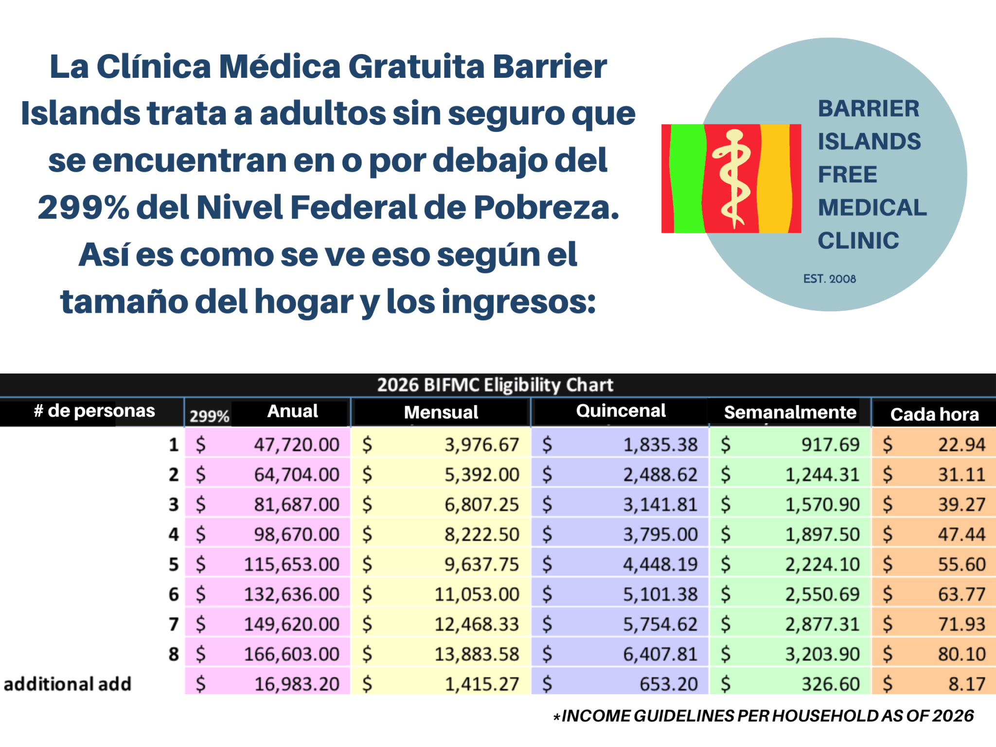 El Departamento de Salud y Servicios Humanos (DHHS) de los Estados Unidos ha determinado el nivel federal de pobreza. La Clínica Gratuita Barrier Islands ofrece asistencia médica a los adultos que tienen ingresos o al este nivel o por debajo del 299 por ciento de este nivel.